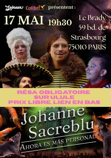 Sabrosón et Colibrí présentent : la projection de Johanne Sacreblu, la parodie la plus croustillante signée Camila Aurora ! Créé en réponse à la diffusion du film français Emilia Pérez, projetée le 17 mai 2025. Venez avec votre meilleure tenue cliché parisienne, et vos meilleures moustaches !