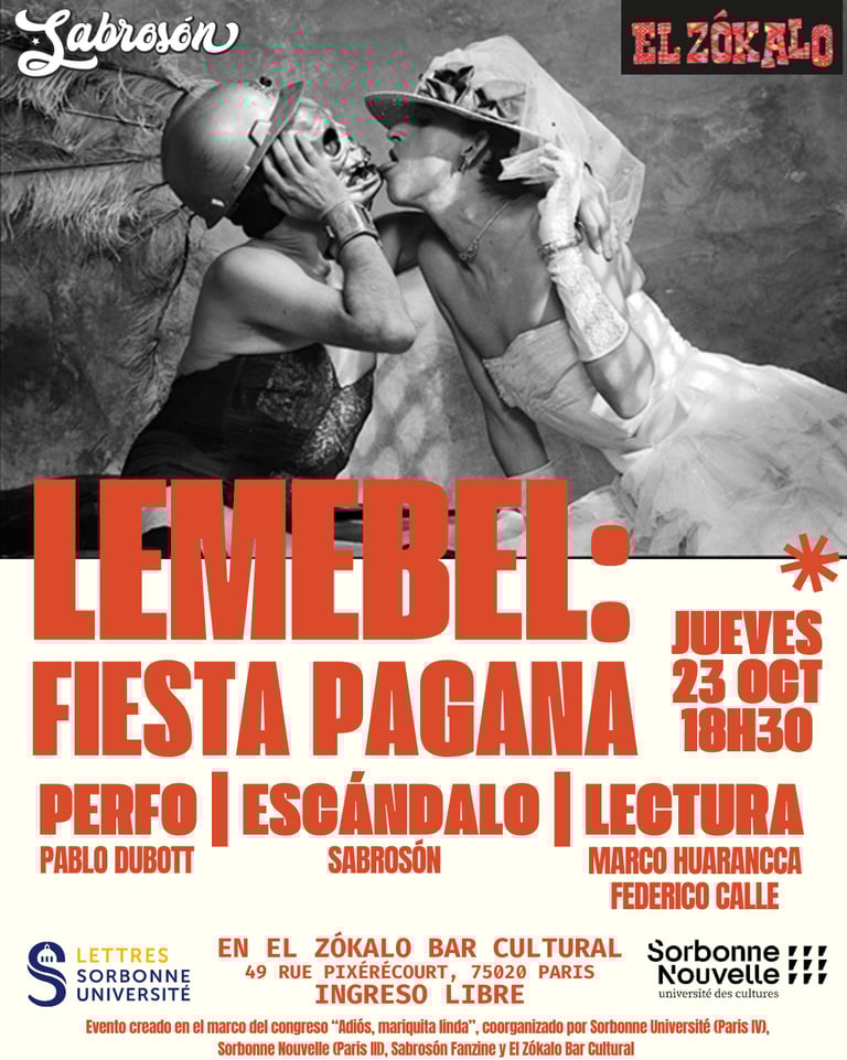 En el marco del congreso "Adiós, mariquita linda" (jornadas coorganizadas junto a la Universidad Sorbonne, la Universidad Sorbonne-Nouvelle y El Zókalo Bar Cultural), Sabrosón invita a una fiesta-performance-lectura-karaoke el jueves 23 de octubre en El Zókalo para conmemorar la obra del escritor chileno Pedro Lemebel. El performer chileno radicado en Francia Pablo Dubott nos deleitará con una acción lemebeliana.